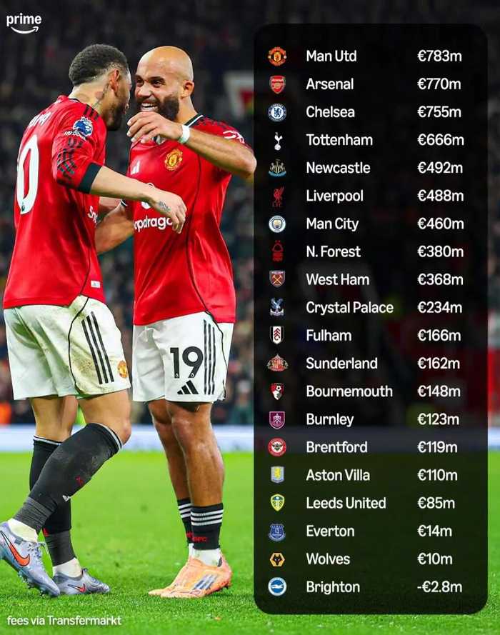 Prime Video Sports发布了过去五个赛季英超俱乐部的净支出统计数据。曼联以7.83亿欧元的净支出位居榜首,成为同期投入最大的球队,而布莱顿成为唯一盈利的球队。